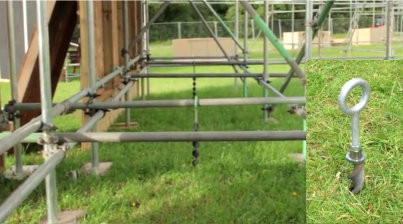 Using a threaded head anchor, install to anchor neck by driving into position. Our anchors are impact in, they drive down on their helix. Screw the scaffold ring bolt (FS602 with M16 locking nut, FS142) or collared eyebolts (FS252) into the top of the threaded head anchor and feed scaffold poles through.