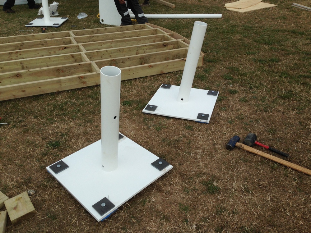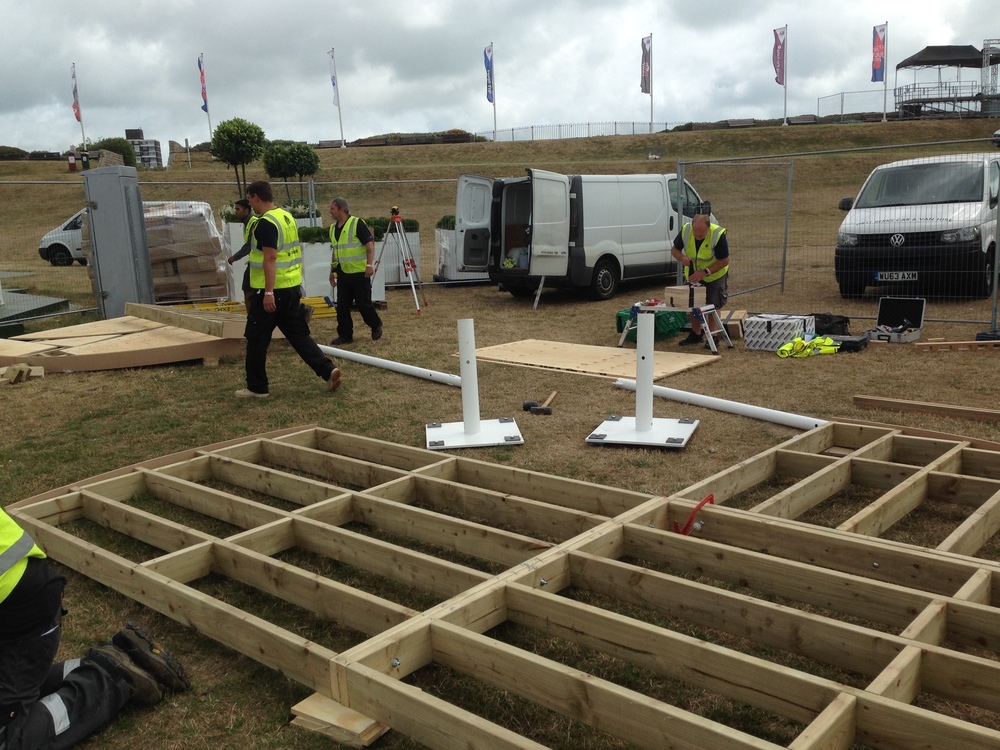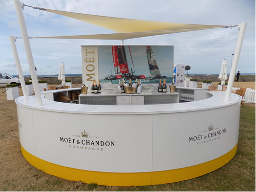 To provide a means of securing 5 leaning columns for a temporary bar for Moet & Chandon at the America's Cup event in Portsmouth. Anchoring system had to be quick to install and remove. Leaving no trace after removal an advantage as no remedial work time had been allowed.
