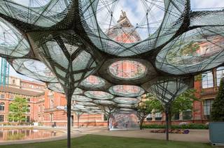 Created by Achim Menges with Moritz Dörstelmann (ICD University of Stuttgart / Achim Menges Architect), Jan Knippers (ITKE University of Stuttgart / Knippers Helbig Advanced Engineering), Thomas Auer (Transsolar Climate Engineering / TUM)
