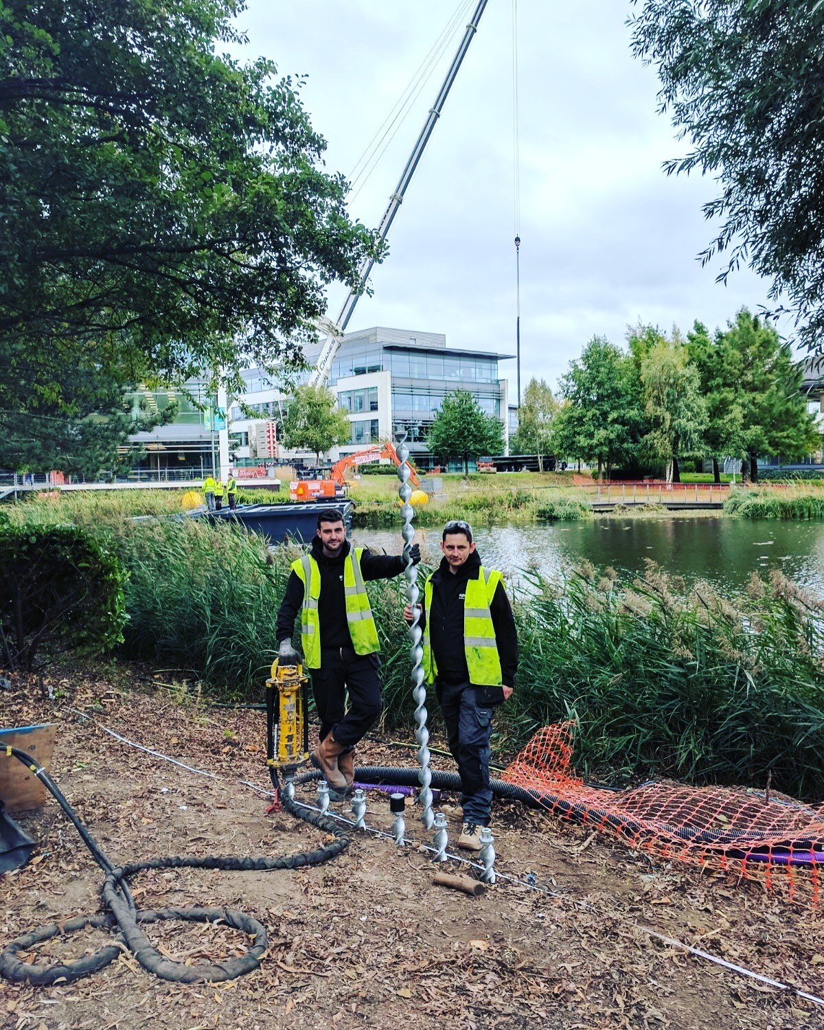 These spirafix will be used as anchor points and needed to be safe and secure so the ground anchors, which twist down into position on their own helix with each impact blow, were installed quite close together for a very neat solution.