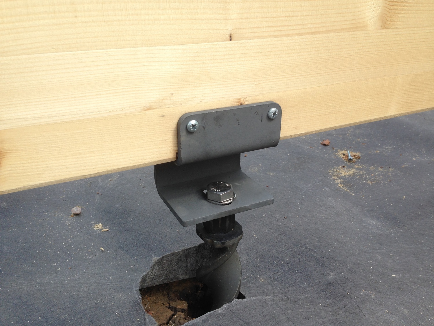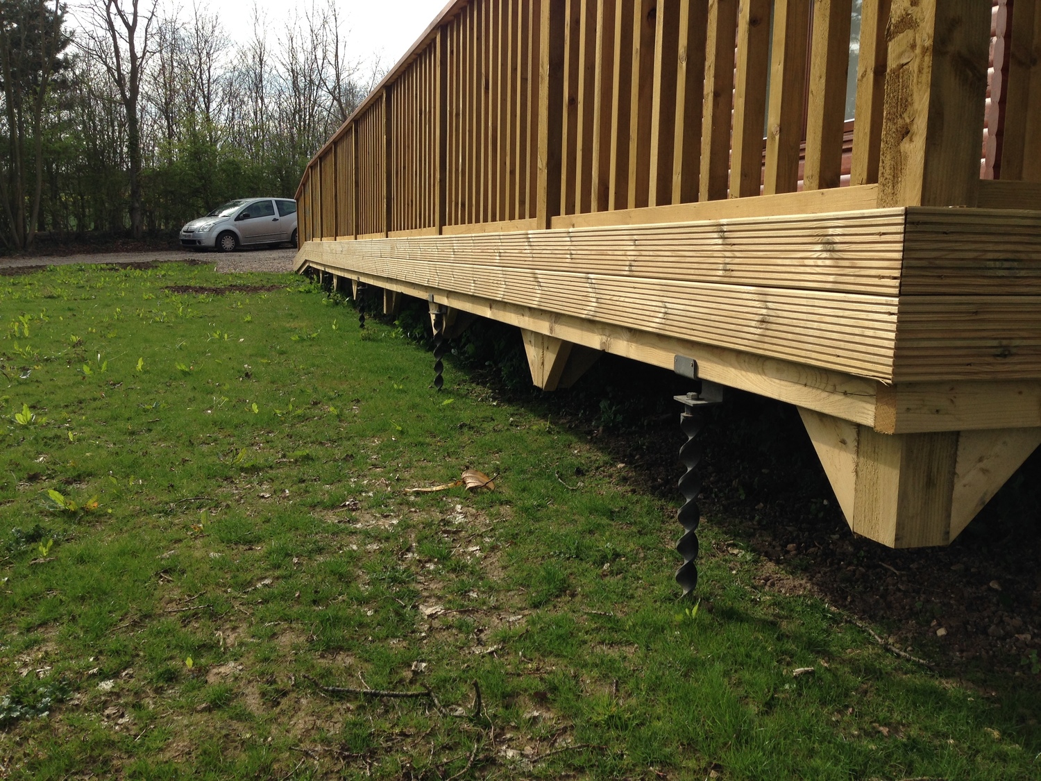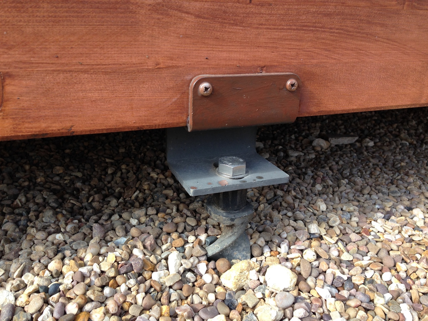 Install anchors using laser measurer/leveller for pinpoint accuracy. Anchors are installed using impact only, the helical anchors twist down into position on their own helix. Attach joist bracket to anchor. Build wooden plaform / decking.