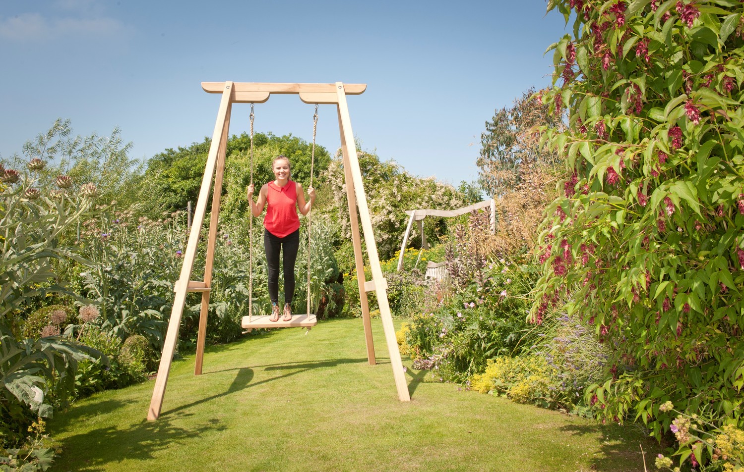 Sitting Spiritually are well known for their oak rope swings to hang from trees. However, not everyone has a suitable tree to hang a swing from, so they developed their oak single high frame, specifically to hang their rope swing from. But….people liked to swing very high on them, so high in fact that the legs of the frame could lift from the ground.